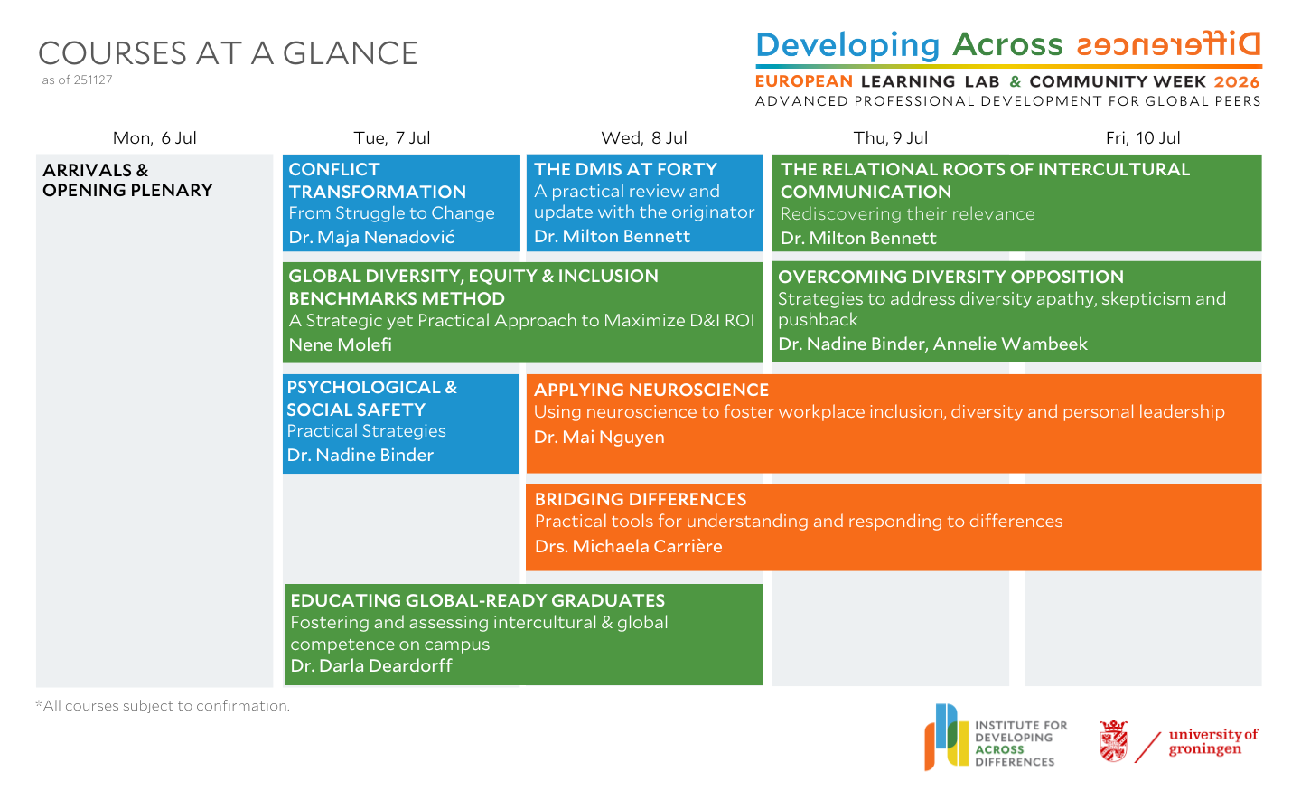 For 2026, we are pleased to offer nine (9) outstanding in-person workshops for those whose work helps individuals, organisations and communities develop across differences. All courses take place from 6-10 July in Groningen, Netherlands. (Details are below.)